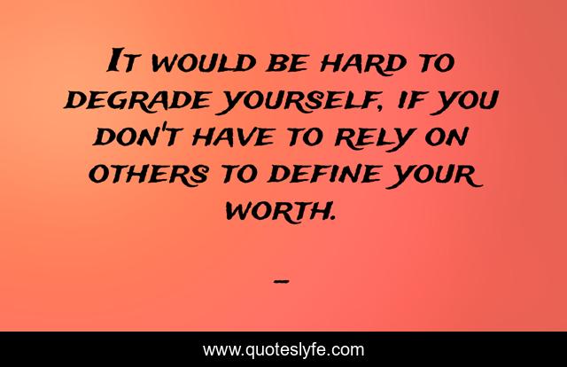 This page presents the quote "It would be hard to degrade yourself, if you don't have to rely on others to define your worth.". Author of this quote is . This quote is about edmond-mbiaka, degrading-yourself, degrade, relying-on-others-to-define-you,.