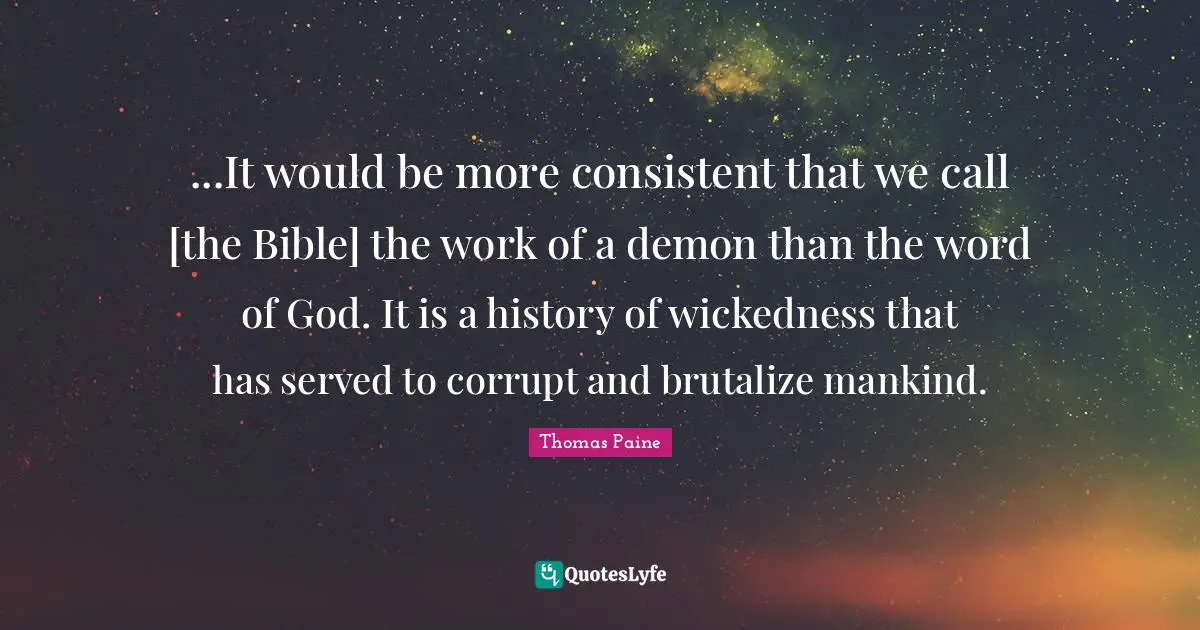 This page presents the quote "...It would be more consistent that we call [the Bible] the work of a demon than the word of God. It is a history of wickedness that has served to corrupt and brutalize mankind.". Author of this quote is Thomas Paine. This quote is about would be, mankind, word of god, wickedness, history, demon, bible, faith religion, work,.