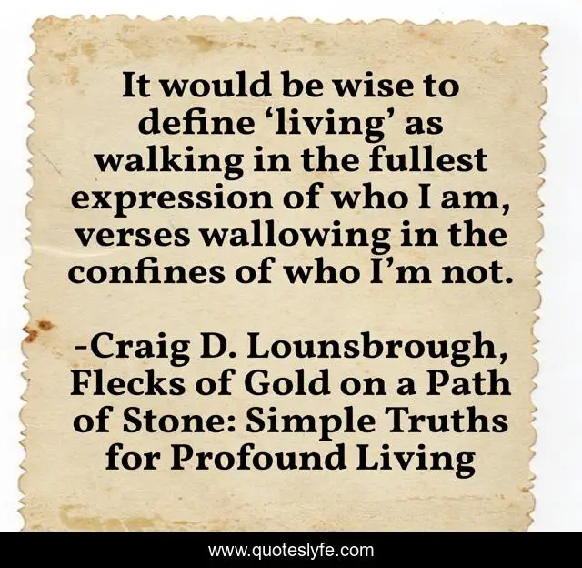 This page presents the quote "It would be wise to define ‘living’ as walking in the fullest expression of who I am, verses wallowing in the confines of who I’m not.". Author of this quote is Craig D. Lounsbrough, Flecks of Gold on a Path of Stone: Simple Truths for Profound Living. This quote is about living, myself, self-awareness, self, personhood, walking, expressing, authenticity, identity,.