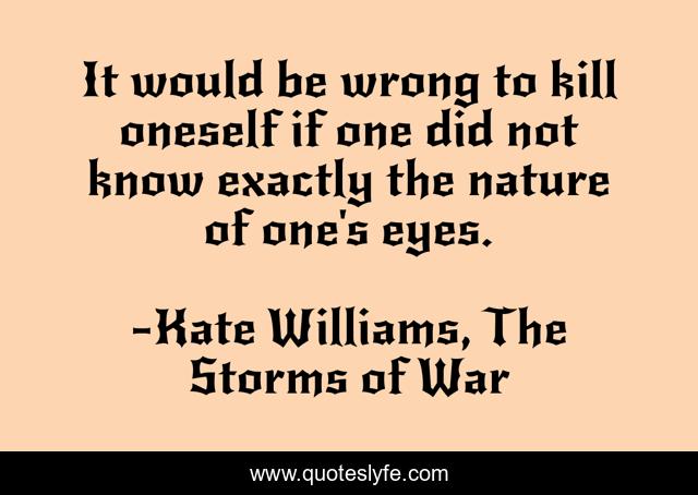 This page presents the quote "It would be wrong to kill oneself if one did not know exactly the nature of one's eyes.". Author of this quote is Kate Williams, The Storms of War. This quote is about kate-williams, eyes, the-storms-of-war,.