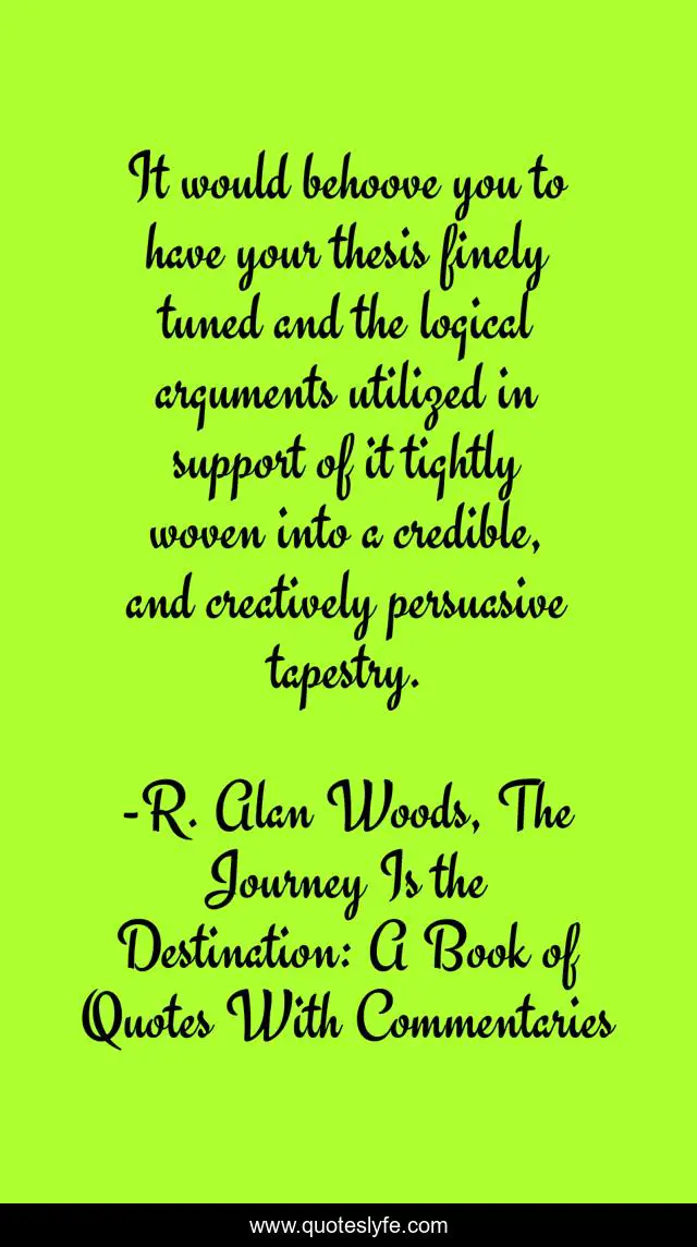 This page presents the quote "It would behoove you to have your thesis finely tuned and the logical arguments utilized in support of it tightly woven into a credible, and creatively persuasive tapestry.". Author of this quote is R. Alan Woods, The Journey Is the Destination: A Book of Quotes With Commentaries. This quote is about argumentation, scholarly, theology, apologetics, logic-of-thought, thesis, persuasion, r-alan-woods,.