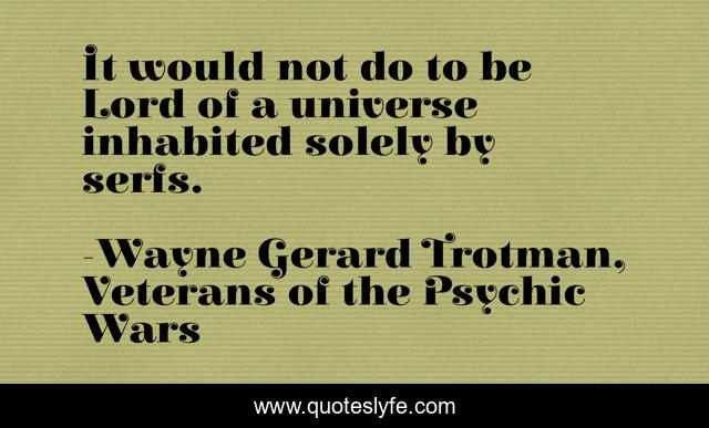 This page presents the quote "It would not do to be Lord of a universe inhabited solely by serfs.". Author of this quote is Wayne Gerard Trotman, Veterans of the Psychic Wars. This quote is about sci-fi, subservience, universe, serfs, science-fiction, domination, leadership, scifi, megalomania,.