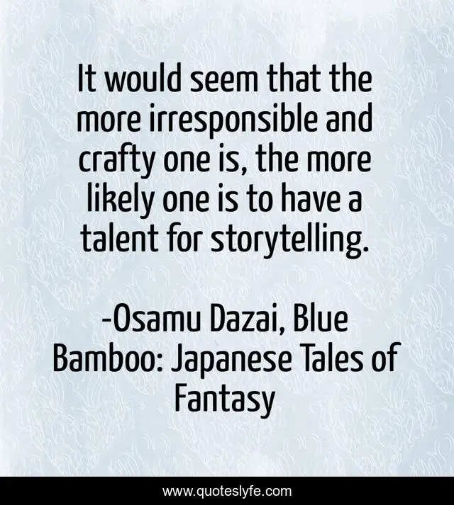 This page presents the quote "It would seem that the more irresponsible and crafty one is, the more likely one is to have a talent for storytelling.". Author of this quote is Osamu Dazai, Blue Bamboo: Japanese Tales of Fantasy. This quote is about japan, japanese, storytelling,.