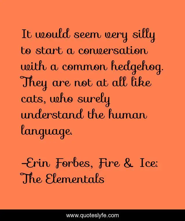 This page presents the quote "It would seem very silly to start a conversation with a common hedgehog. They are not at all like cats, who surely understand the human language.". Author of this quote is Erin Forbes, Fire & Ice: The Elementals. This quote is about cats-humo, funny, ya-books, fantasy, cats, comedy, hedgehog,.