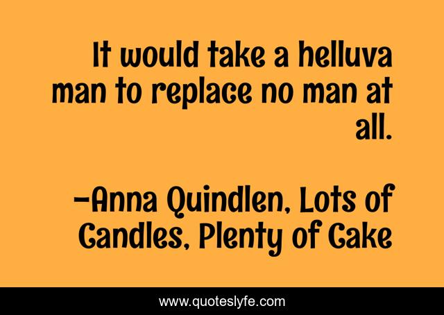 This page presents the quote "It would take a helluva man to replace no man at all.". Author of this quote is Anna Quindlen, Lots of Candles, Plenty of Cake. .