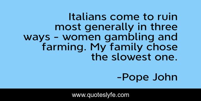 This page presents the quote "Italians come to ruin most generally in three ways - women gambling and farming. My family chose the slowest one.". Author of this quote is Pope John. .