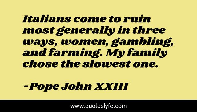 This page presents the quote "Italians come to ruin most generally in three ways, women, gambling, and farming. My family chose the slowest one.". Author of this quote is Pope John XXIII. This quote is about gambling, three, women,.