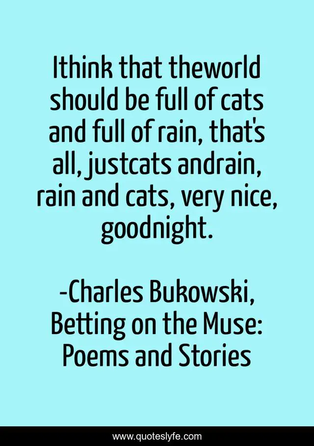 This page presents the quote "Ithink that theworld should be full of cats and full of rain, that's all, justcats andrain, rain and cats, very nice, goodnight.". Author of this quote is Charles Bukowski, Betting on the Muse: Poems and Stories. This quote is about cats, rain, storm, night,.