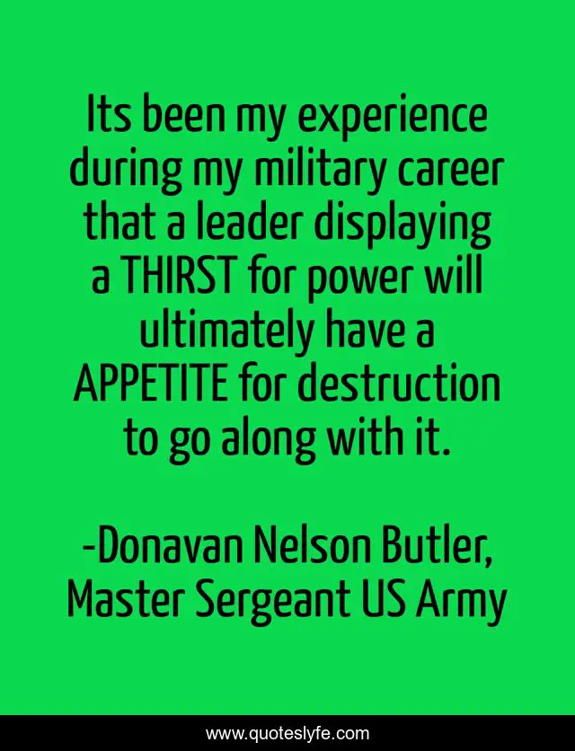 This page presents the quote "Its been my experience during my military career that a leader displaying a THIRST for power will ultimately have a APPETITE for destruction to go along with it.". Author of this quote is Donavan Nelson Butler, Master Sergeant US Army. This quote is about soldiering, military, leadership-development, leadership, servant-leadership,.