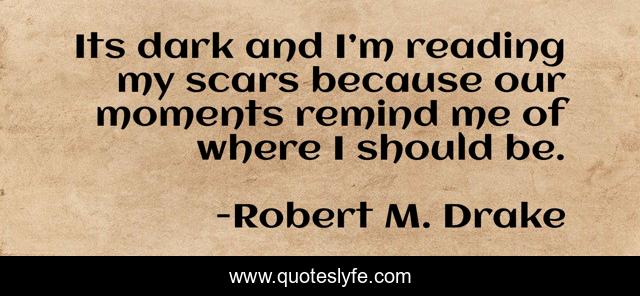 This page presents the quote "Its dark and I’m reading my scars because our moments remind me of where I should be.". Author of this quote is Robert M. Drake. This quote is about lovequotes, sadquotes, poetry, quotes, instadaily, happyquotes, relationships, sayings, writer,.