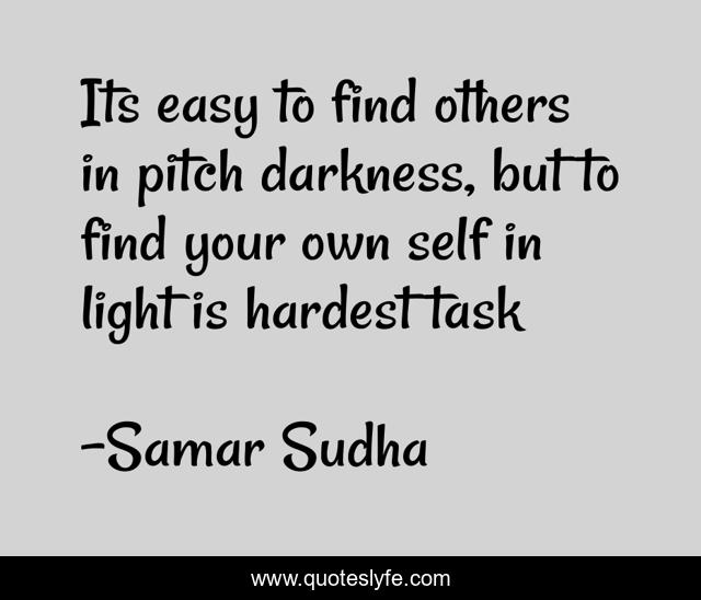 This page presents the quote "Its easy to find others in pitch darkness, but to find your own self in light is hardest task". Author of this quote is Samar Sudha. .