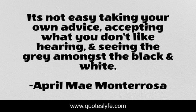 This page presents the quote "Its not easy taking your own advice, accepting what you don't like hearing, & seeing the grey amongst the black & white.". Author of this quote is April Mae Monterrosa. This quote is about accepting-personalities, taking-your-own-advice, black-and-white, acceptance, grey-areas, self-growth-and-improvement,.