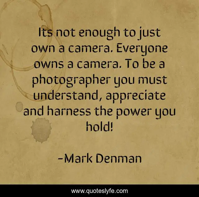 This page presents the quote "Its not enough to just own a camera. Everyone owns a camera. To be a photographer you must understand, appreciate and harness the power you hold!". Author of this quote is Mark Denman. This quote is about inspirational-of-the-day, confidence, artists-life, positive, photography, motivational, optimistic, inspirational, artists,.