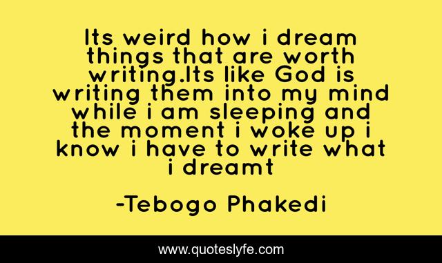 This page presents the quote "Its weird how i dream things that are worth writing.Its like God is writing them into my mind while i am sleeping and the moment i woke up i know i have to write what i dreamt". Author of this quote is Tebogo Phakedi. This quote is about god-s-plan, writing-advice, dream, dreaming, writing,.
