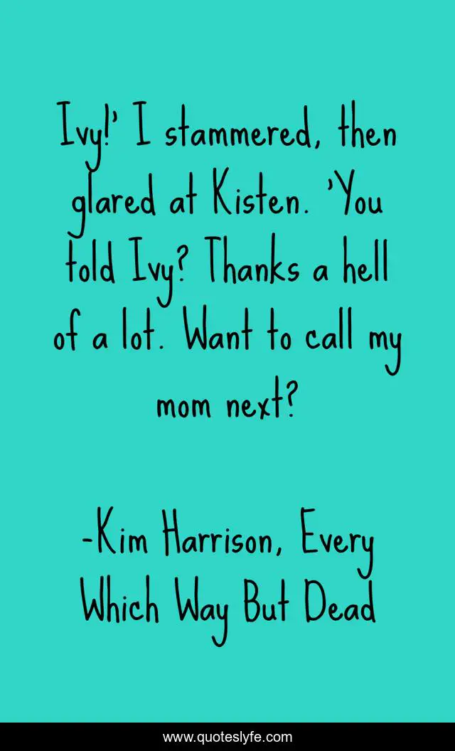 This page presents the quote "Ivy!' I stammered, then glared at Kisten. 'You told Ivy? Thanks a hell of a lot. Want to call my mom next?". Author of this quote is Kim Harrison, Every Which Way But Dead. This quote is about kisten, vampire, fiction, romance, supernatural, rachel-morgan,.