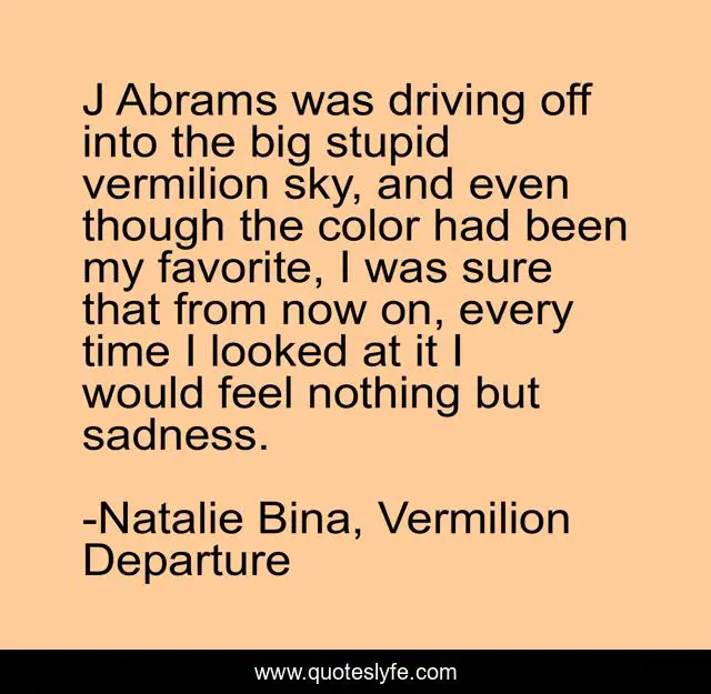 This page presents the quote "J Abrams was driving off into the big stupid vermilion sky, and even though the color had been my favorite, I was sure that from now on, every time I looked at it I would feel nothing but sadness.". Author of this quote is Natalie Bina, Vermilion Departure. This quote is about relationships, colors, sky, sad,.