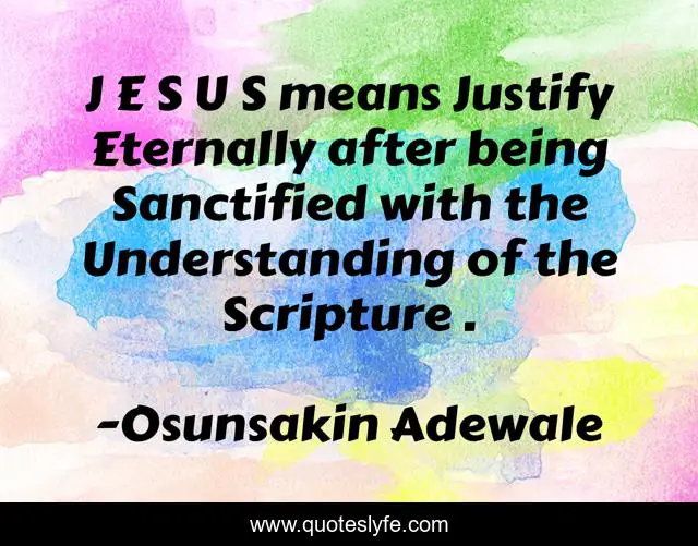 This page presents the quote "J E S U S means Justify Eternally after being Sanctified with the Understanding of the Scripture .". Author of this quote is Osunsakin Adewale. .