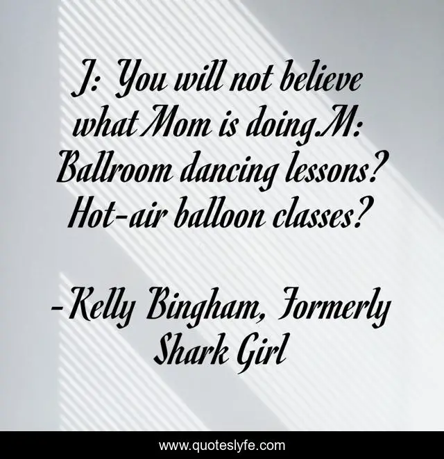 This page presents the quote "J: You will not believe what Mom is doing.M: Ballroom dancing lessons? Hot-air balloon classes?". Author of this quote is Kelly Bingham, Formerly Shark Girl. This quote is about jane, dating, michael, mom,.