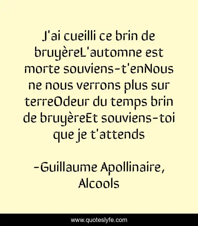 "Guillaume Apollinaire, Alcools Quotes." Quoteslyfe.com, 2025. Mon. 08 Dec. 2025. <https://www.quoteslyfe.com/quote/J-ai-cueilli-ce-brin-de-bruy-25181>.