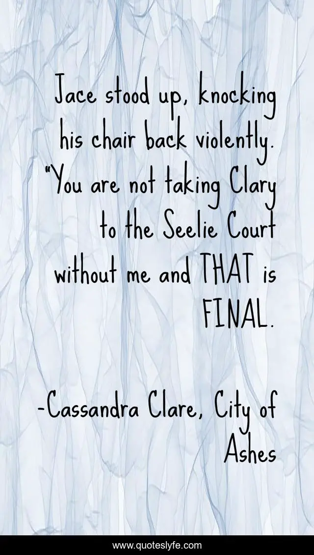 This page presents the quote "Jace stood up, knocking his chair back violently. "You are not taking Clary to the Seelie Court without me and THAT is FINAL.". Author of this quote is Cassandra Clare, City of Ashes. .
