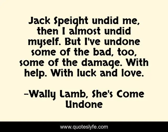 This page presents the quote "Jack Speight undid me, then I almost undid myself. But I've undone some of the bad, too, some of the damage. With help. With luck and love.". Author of this quote is Wally Lamb, She's Come Undone. This quote is about she-s-come-undone, life, love, affection, luck,.