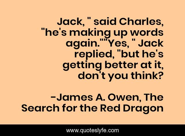 This page presents the quote "Jack, " said Charles, "he's making up words again.""Yes, " Jack replied, "but he's getting better at it, don't you think?". Author of this quote is James A. Owen, The Search for the Red Dragon. This quote is about creativity, humor,.