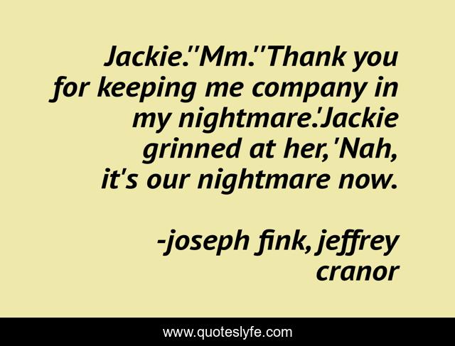 This page presents the quote "Jackie.''Mm.''Thank you for keeping me company in my nightmare.'Jackie grinned at her, 'Nah, it's our nightmare now.". Author of this quote is joseph fink, jeffrey cranor. This quote is about nightmares, friendship,.