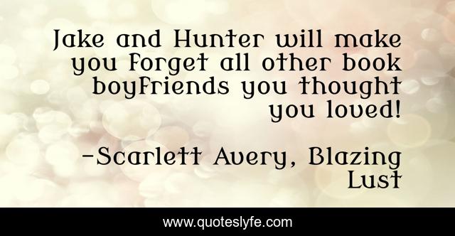 This page presents the quote "Jake and Hunter will make you forget all other book boyfriends you thought you loved!". Author of this quote is Scarlett Avery, Blazing Lust. This quote is about romantic-comedy, billionaire-romance, erotic-romance, alpha-males, menage-romance,.