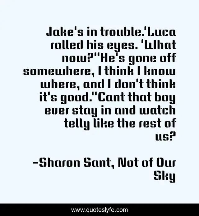 "Sharon Sant, Not of Our Sky Quotes." Quoteslyfe.com, 2025. Sat. 06 Dec. 2025. <https://www.quoteslyfe.com/quote/Jake-s-in-trouble-Luca-rolled-his-148921>.