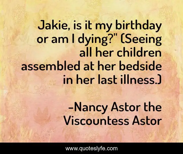 This page presents the quote "Jakie, is it my birthday or am I dying?" (Seeing all her children assembled at her bedside in her last illness.)". Author of this quote is Nancy Astor the Viscountess Astor. This quote is about deathbed, death, dying-last-words, dying,.