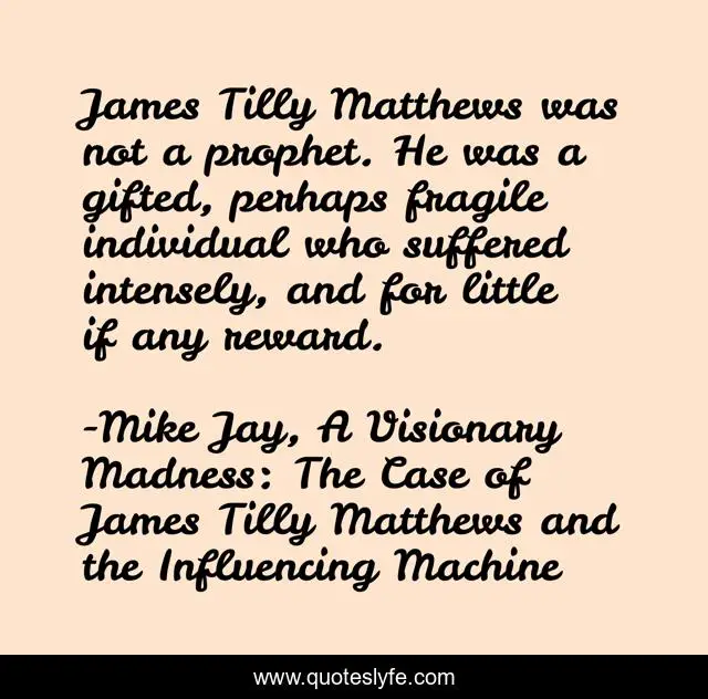 "Mike Jay, A Visionary Madness: The Case of James Tilly Matthews and the Influencing Machine Quotes." Quoteslyfe.com, 2025. Fri. 05 Dec. 2025. <https://www.quoteslyfe.com/quote/James-Tilly-Matthews-was-not-a-prophet-103887>.