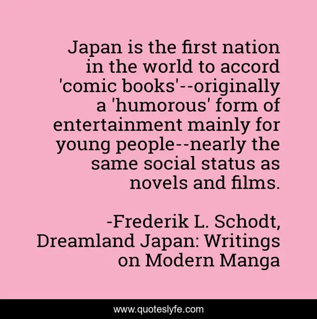 This page presents the quote "Japan is the first nation in the world to accord 'comic books'--originally a 'humorous' form of entertainment mainly for young people--nearly the same social status as novels and films.". Author of this quote is Frederik L. Schodt, Dreamland Japan: Writings on Modern Manga. This quote is about entertainment, comics, culture, anime, japan, manga,.