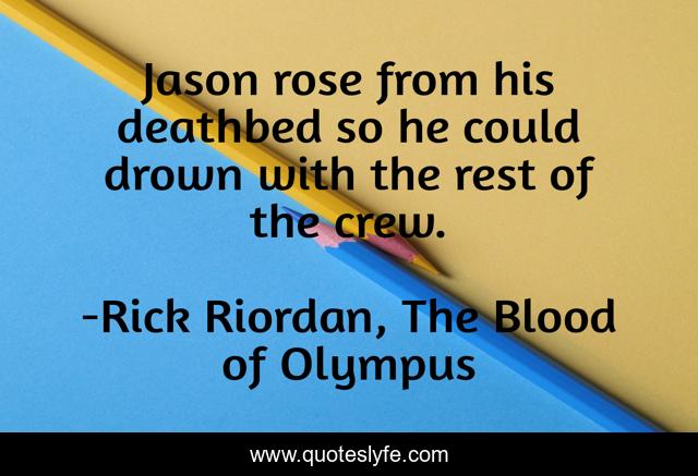 This page presents the quote "Jason rose from his deathbed so he could drown with the rest of the crew.". Author of this quote is Rick Riordan, The Blood of Olympus. This quote is about argo-two, percy-jackson, jason-grace,.