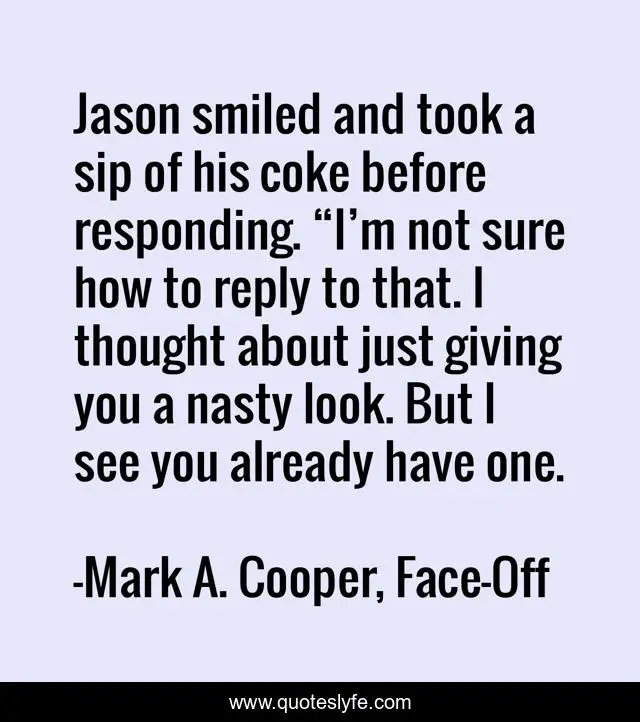 This page presents the quote "Jason smiled and took a sip of his coke before responding. “I’m not sure how to reply to that. I thought about just giving you a nasty look. But I see you already have one.". Author of this quote is Mark A. Cooper, Face-Off. This quote is about witty, wit, funny-humor,.