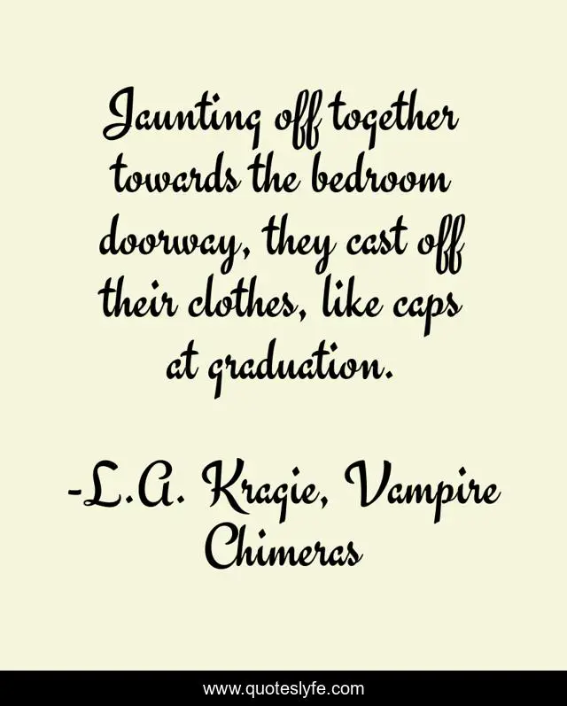 This page presents the quote "Jaunting off together towards the bedroom doorway, they cast off their clothes, like caps at graduation.". Author of this quote is L.A. Kragie, Vampire Chimeras. This quote is about romance, joy, play, exuberance,.