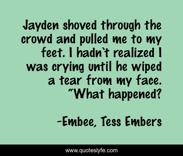 This page presents the quote "Jayden shoved through the crowd and pulled me to my feet. I hadn’t realized I was crying until he wiped a tear from my face. “What happened?". Author of this quote is Embee, Tess Embers. This quote is about romance, crying,.