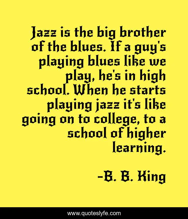 This page presents the quote "Jazz is the big brother of the blues. If a guy's playing blues like we play, he's in high school. When he starts playing jazz it's like going on to college, to a school of higher learning.". Author of this quote is B. B. King. This quote is about school, college, brother,.