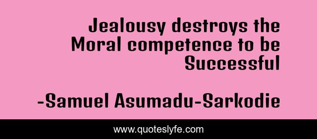 This page presents the quote "Jealousy destroys the Moral competence to be Successful". Author of this quote is Samuel Asumadu-Sarkodie. This quote is about proverbs, words-of-knowledge, discernment, parables, words-of-wisdom, inspiration,.