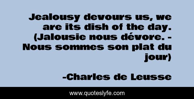 This page presents the quote "Jealousy devours us, we are its dish of the day. (Jalousie nous dévore. - Nous sommes son plat du jour)". Author of this quote is Charles de Leusse. This quote is about jour, jalousie, jealousy, plat, dish, day,.