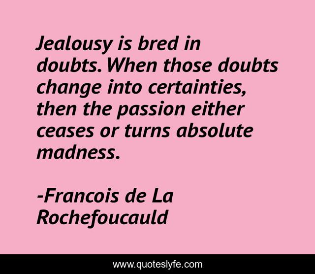 This page presents the quote "Jealousy is bred in doubts. When those doubts change into certainties, then the passion either ceases or turns absolute madness.". Author of this quote is Francois de La Rochefoucauld. This quote is about passion, madness, change,.