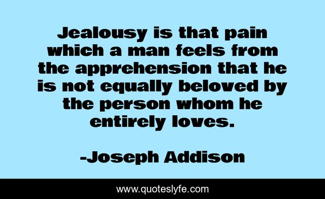 This page presents the quote "Jealousy is that pain which a man feels from the apprehension that he is not equally beloved by the person whom he entirely loves.". Author of this quote is Joseph Addison. This quote is about jealousy, philosophical, love, affection, pain,.