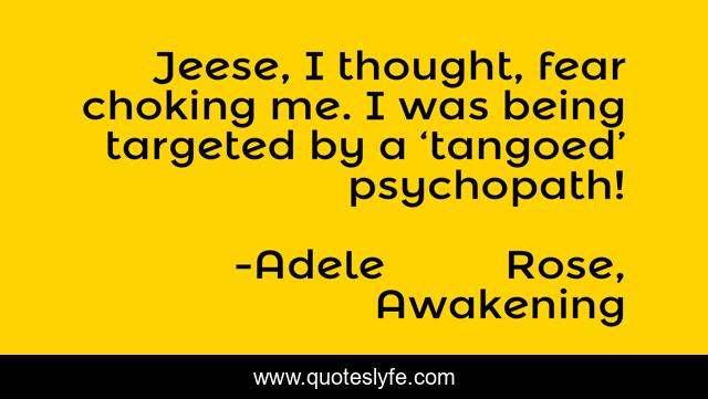 This page presents the quote "Jeese, I thought, fear choking me. I was being targeted by a ‘tangoed’ psychopath!". Author of this quote is Adele Rose, Awakening. This quote is about fear, alex, humour,.