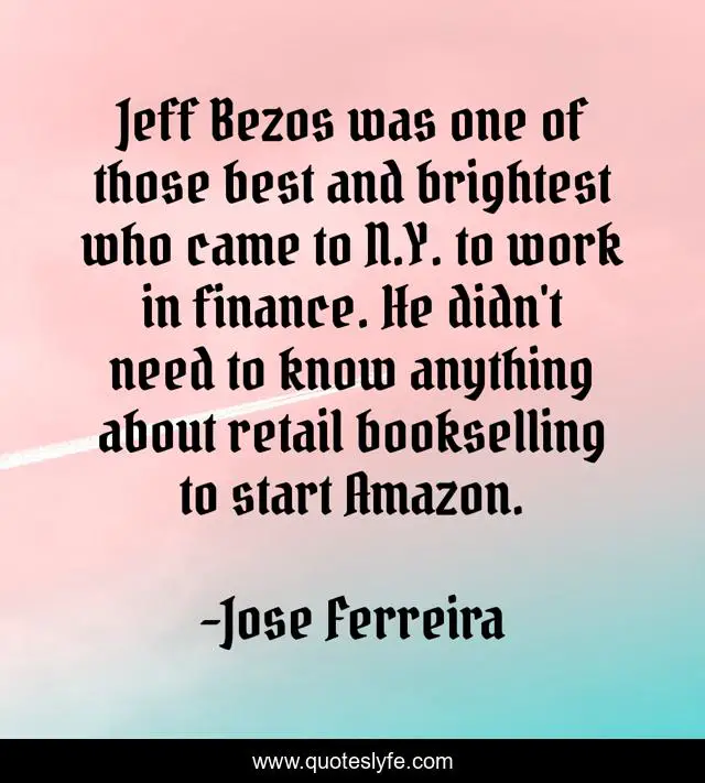 This page presents the quote "Jeff Bezos was one of those best and brightest who came to N.Y. to work in finance. He didn't need to know anything about retail bookselling to start Amazon.". Author of this quote is Jose Ferreira. This quote is about start, work, best,.