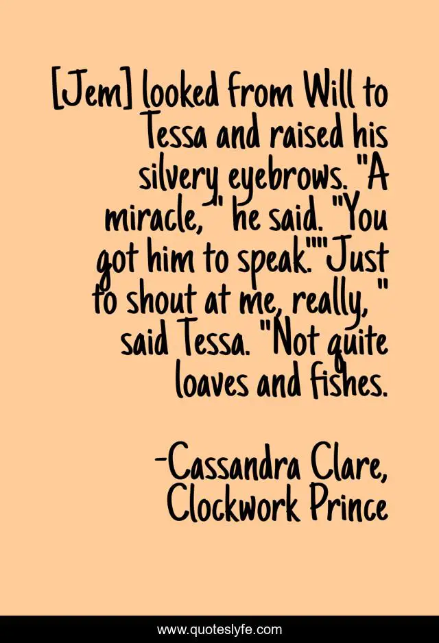 [Jem] looked from Will to Tessa and raised his silvery eyebrows. "A miracle, " he said. "You got him to speak.""Just to shout at me, really, " said Tessa. "Not quite loaves and fishes.