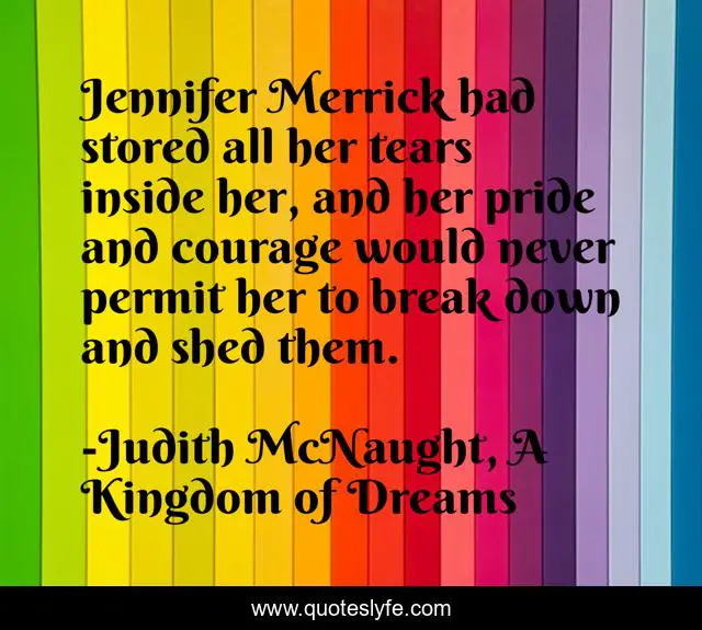 This page presents the quote "Jennifer Merrick had stored all her tears inside her, and her pride and courage would never permit her to break down and shed them.". Author of this quote is Judith McNaught, A Kingdom of Dreams. This quote is about break, tears, pride, cry, stock,.