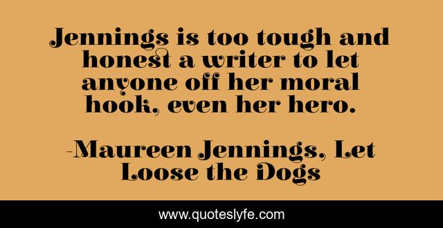 This page presents the quote "Jennings is too tough and honest a writer to let anyone off her moral hook, even her hero.". Author of this quote is Maureen Jennings, Let Loose the Dogs. .
