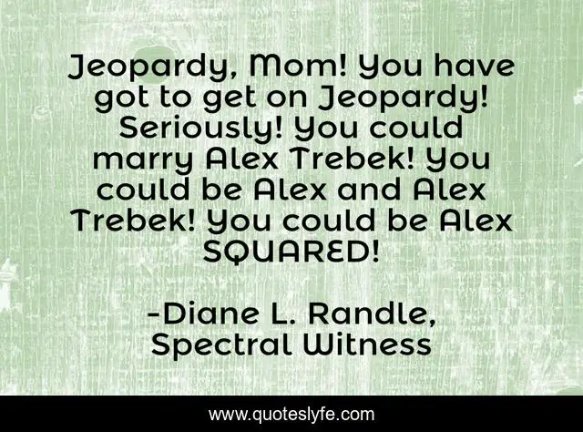 This page presents the quote "Jeopardy, Mom! You have got to get on Jeopardy! Seriously! You could marry Alex Trebek! You could be Alex and Alex Trebek! You could be Alex SQUARED!". Author of this quote is Diane L. Randle, Spectral Witness. This quote is about drowning, mothers-and-daughters, paranormal, psychological, bloodlines, suspense, thriller,.