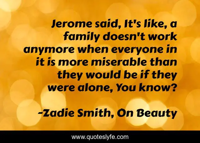 This page presents the quote "Jerome said, It's like, a family doesn't work anymore when everyone in it is more miserable than they would be if they were alone, You know?". Author of this quote is Zadie Smith, On Beauty. .