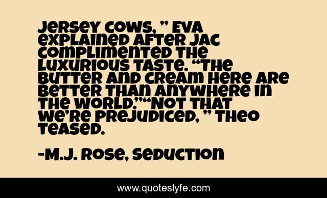 This page presents the quote "Jersey cows, ” Eva explained after Jac complimented the luxurious taste. “The butter and cream here are better than anywhere in the world.”“Not that we’re prejudiced, ” Theo teased.". Author of this quote is M.J. Rose, Seduction. This quote is about humorous, funny, comedy, prejudice,.