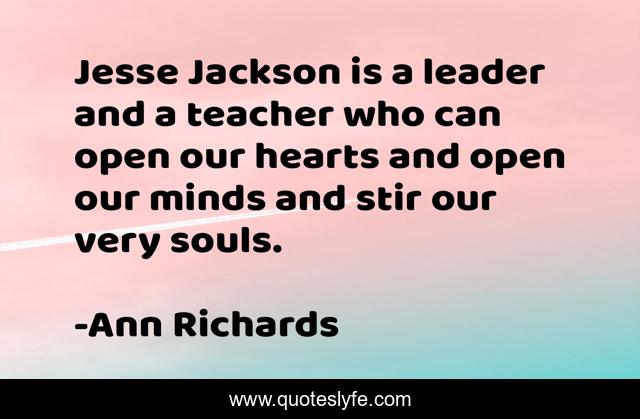 This page presents the quote "Jesse Jackson is a leader and a teacher who can open our hearts and open our minds and stir our very souls.". Author of this quote is Ann Richards. This quote is about hearts, leader, minds,.